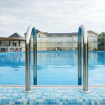 Бассейн теплый, подсветка. Детский- классный, глубина примерно 80см, есть «фонтан». Открытый бассейн работает только в теплое время года. Отделка не понравилась, странный какой-то облицовочный материал. Кабинок для переодевания только две, бар, пара-тройка столиков; шезлонгов достаточно. Вокруг территории бассейна газон, есть маленькая детская площадка, площадка для пляжного волейбола, один туалет. Сотрудника, который выдает полотенца, приходилось постоянно ждать. Чисто. Музыкальное сопровождение- радио. Приятного отдыха и интересного времяпрепровождения.