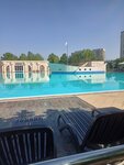 Отличный чистый бассейн с морской водой. Есть раздевалки, много шизлонгов, проводят акваэробику, дежурят спасатели. Указанно что аода подогревается, но не заметил, наверное из-за большлго объёма это сильно не чувствуется.Территория ухоженная. Рядом детский бассейн с горками, бар-кафе. Цены нормальные. Отличное место.