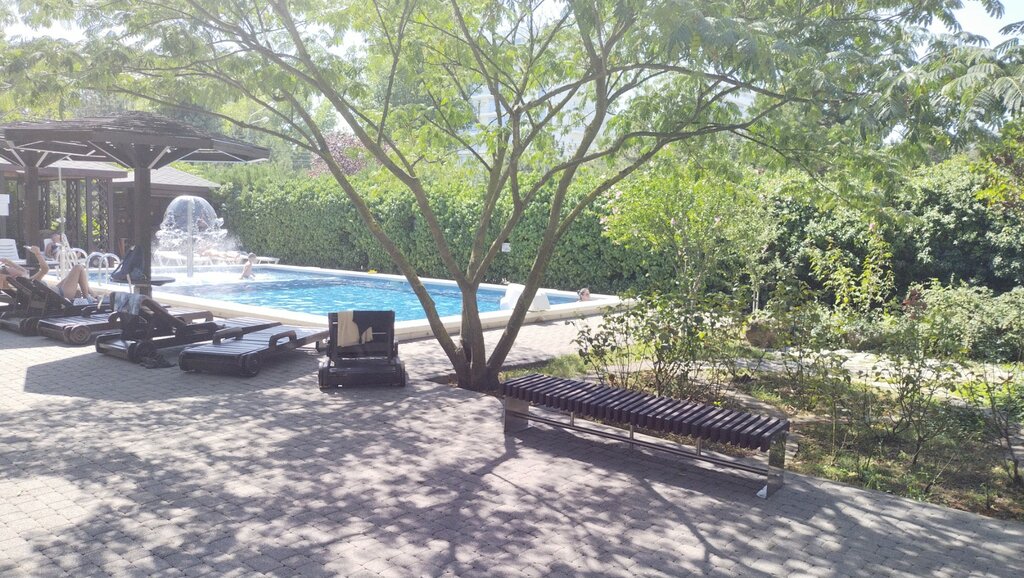 Хороший подогреваемый бассейн, в сентябре людей мало, лежаки свободны имеются беседки для "посидеть", также есть душ. твердая четверка с плюсом.