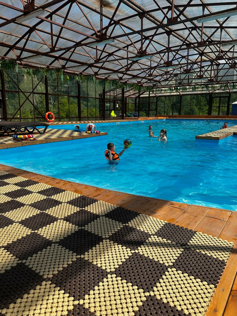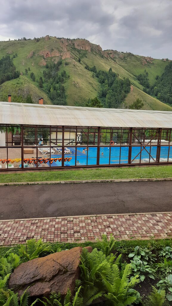 Мы пошли в этот бассейн после посещения Торгашинского хребта, совсем недалеко. На улице дул ветер, поэтому крытый бассейн это было прям необходимо. Вода очень тёплая. Глубина бассейна от 1,1 до 2,4 м, есть жилеты, круги. Внутри были открыты некоторые окна, поэтому было не душно. В стоимость входит полотенце, это очень удобно, внутри есть места для переодевания и душевая, но нет розеток, а хотелось высушить волосы, так как к вечеру было довольно прохладно на улице. Туалеты на улице или в кафе. Территория отеля красивая, ухоженная, там можно просто погулять, зайти в кафе. Виды вокруг бомбические!