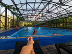 Мы приехали в бассейн в жаркую погоду и то что он закрытый сыграло не в пользу комфортного пребывания в нем! Заходишь в бассейн , как в огромную теплицу!Крыша не защищает от палящего солнца и плюс большая влажность создают какую то безвоздушную атмосферу! Были открыты все большие окна , но это не спасало совершенно!Так как я вообще не выношу духоту , для меня это большой минус! Хотя другие люди плавали и по моему это их совсем не беспокоило! Мне пояснили , что , когда прохладно , то под куполом комфортно плавать. На следующий день было несколько прохладнее , за счет ветра и я радостная купалась чувствуя свежий воздух , но радость моя была не долгой😂 Кто то из посетителей , кто был с маленькими детками пожаловался , что им прохладно и работник бассейна , просто с редким интузиазмом принялся закрывать все окна , при чем закрывал их и там , где плавают только взрослые , на глубине. Бассейн достаточно большой и в самом начале мелководье там плавают детки , а в конце глубина и если и заплывают туда ребятишки , то уже более взрослые! Я попросила оставить хотя бы одно окошко , моя просьба была проигнорирована ! Жалуются , что холодно , но ок с одного окошка не продует вес бассейн и до детей не достанет сквозняк! Но окошко было закрыто! Ну как бы хорошо , но ведь я не бесплатно здесь нахожусь и тоже имею право на комфорт🤷 Это мне очень не понравилось и я считаю , что в таких ситуациях нужно находить компромисс и создавать комфорт всем гостям или хотя бы попытаться это сделать! Вода была приятно температуры , глубина позволяла плавать с удовольствием и даже нырять , но почему то было в воде не скажу что много , но достаточное количество насекомых ! И мух и бабочек! Хотя , когда мы были в Дружбе , а там бассейны открытые , насекомых небыло вовсе или было такое небольшое количество , что я даже не запомнила. А здесь постоянно отводишь от себя мух и всяких жуков! За это тоже ставим минус , небольшой, но ставим! Так в принципе на территории бассейна чисто, есть лежаки с матрасами , как внутри , так и снаружи , есть душевая , в которой можно обмыться после бассейна. На улице несколько зонтов , немного но есть! И в целом приятное впечатление от посещения данного бассейна , за исключением нескольких нюансов , которые я обозначила выше! В бассейне достаточно свободно , нет ощущения , что локтями толкаешься с людьми , хотя посетителей достаточно много! Короче , для разнообразия можно посетить данную локацию!