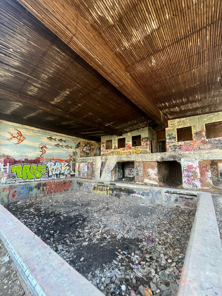 Отличная заброшка. Сохранность средняя. В хорошем состоянии осталась оригинальная советская мозаика. Некоторые современные граффити очень талантливо сделаны. Заезд есть и проход свободный.