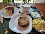 It's a great cafe, and the most important thing is that the dishes are of good quality. A large selection of second courses, salads, pies and cakes. Drinks are also a good choice - teas (including herbal), coffee. The staff works quickly and smoothly.