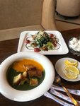 пицца была вкусная, а вот суп из морепродуктов был похож на томатную пасту с плавающими в ней морепродуктами, которые очень хотели, но не могли утонуть. мидии горчили, а кальмары почти сырые ( зато чай и подача порадовали