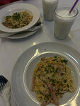 Ужасная еда, заказали блинчик с форелью, оливье, и лимонад с джусболами, принесли стакан с лимонадом в каких то мелких волосах, ладно хоть поменяли, но и результат не стал лучше, все так же, только поменьше волос было, в блине вообще нашла длинный волос, отвратительное впечатление об этом "кафе", а ценник загнут🤬🤬, заправка к салату вообще на вкус химозная, хуже даже чем в обычном супермаркете, это кафе даже забегаловкой назвать нельзя, какой то ужас