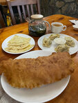 Из плюсов - гостеприимство, также быстрая подача, чистота, да не новое все, но атмосфера уютная, лыжи, сноуборд, гитара, мы заказывали облепиховый чай, сырный суп и лепешки с картофелем и сыром. Жирненько, с душой. Единственное сухари были разноцветные и из темного хлеба жестковаты, но сам суп и лепешки местные - очень вкусные!