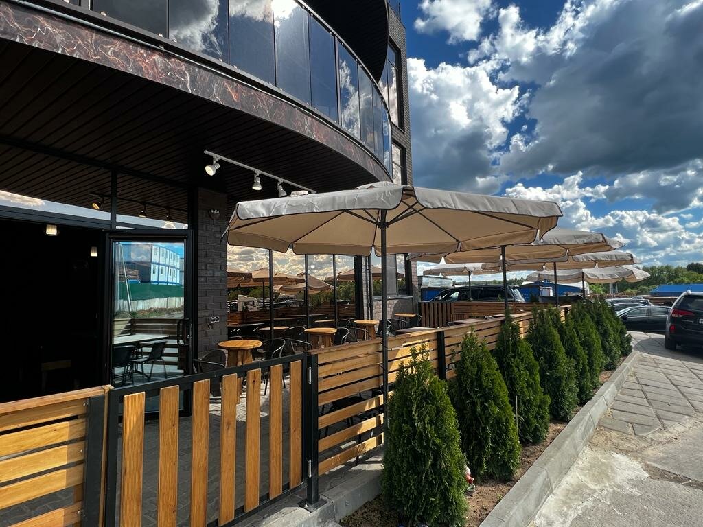Главный плюсище этого места: сервис! Сервис тут высочайшего уровня, чего совсем не ожидаешь. Главным образом я имею ввиду официанта-администратора. Есть велопарковка :) И веранда. Я была в 12-13 дня, кроме меня из посетителей лишь один мужчина еще был и то он ждал заказ с собой. Все очень чисто, выхолощено. Вообще, не ожидаешь в этом забытом Богом месте увидеть такое кафе. Заказывала куриный шашлык и шампиньоны гриль. Грибы мне понравились очень. Мясо было свежее и сочное. Увы я больше люблю не маринованый шашлык, а чтобы у мяса был натуральный вкус. Понравилось что кухня открытая и можно понаблюдать как готовят блюда. Больше всего мне понравилось обслуживание и гостеприимство, даже с учетом моего нонконформизма. Не всегда есть с собой наличные деньги, поэтому не всегда есть влзможность оставить чаевые. Очень не хватает кьюар кода чтобы можно было оставить чаевые безналично! Надеюсь, что территорию рядом с кафе вскоре облагородят и можно будет посидеть и на веранде.
