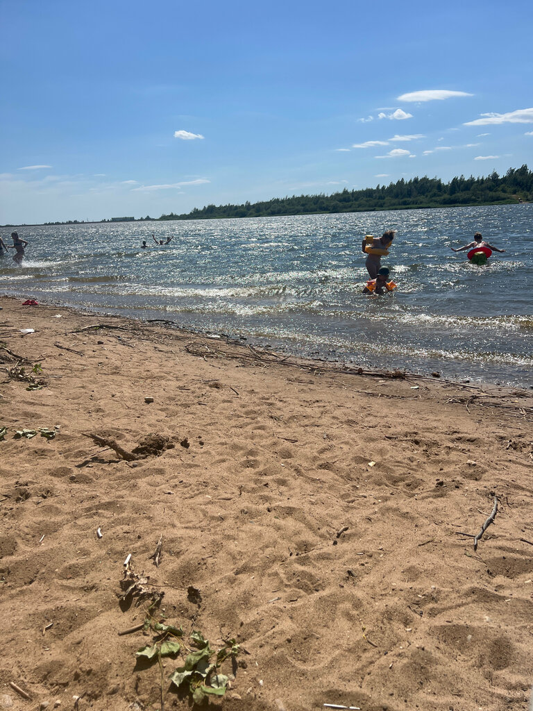 A very pleasant place. The lake is framed by a forest. The water is tea-colored because of the peat bogs. Warm on top, cool on the bottom. It's fine, with the children itself. There is a large parking lot. Grass beach. There are changing rooms, gazebos. A kiosk with corn and all sorts of goodies.