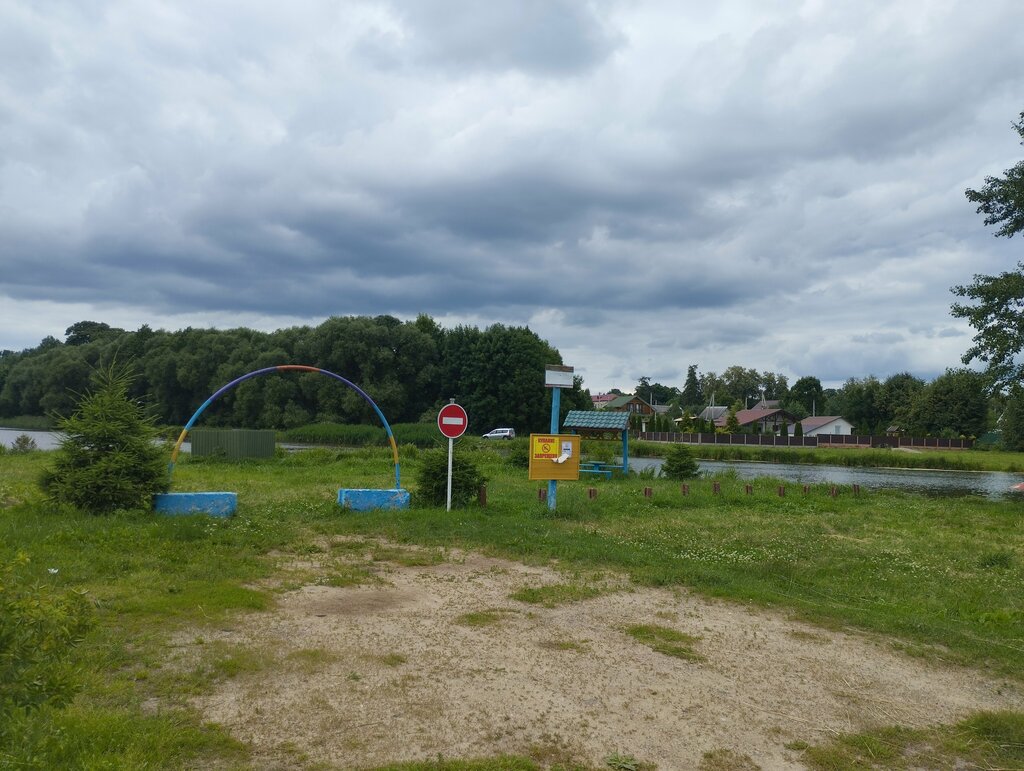 There are several gazebos, a cabin overgrown with nettles, and where to park. It'll do for a picnic. There is a poster about the prohibition of swimming in the center of the beach. Overturned dumpsters are provided with instructions to take garbage home.