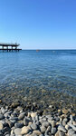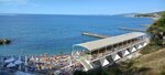 Очень чистая вода , не много людей , тихое место . 2 кафе одна столовая . Парковка для машин переполнена, 50% пляжа заставлены лежаками . Слева мелкая Галька вперемешку с песком . Справа от пирса крупные камни .