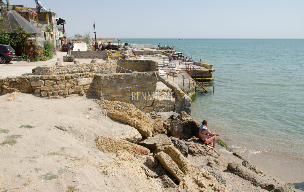 Это место сложно назвать пляжем, маленький пятачок песка рядом с обломками и торчащими из воды железками. Грязь везде, алкоголики и собаки . Страшный забор отделяющий этот пляж от чистого пляжа гостиницы «Корсар». Людей на этом пляже мало, потому что, ходить на него не приятно. Обломанные штормом конструкции. В песке мусор. Пляж не убирают- от слова совсем. Из плюсов-Относительно чистое море. Близость к городу . Тихий район. Красивый вид на город. Чуть левее есть, пляжи без песка со спуском в море можно там отдохнуть, боле менее чисто. Поставить машину та еще каторга , впрочем такая же как и заезд и выезд. С детьми вообше не стоит идти.