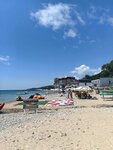 Пляж доступный для всех не очень большой. Значительную часть пляжа занимает зона выделенная для детских спортивных лагерей. Но места всем хватает. Дно отличное! Крупные камни без острых краев и песок. На пляже расположена точка с бананом, парашютом и другими водными аттракционами. Аренда лежаков под тентом тоже есть.