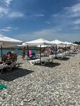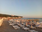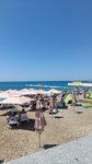 Место хорошее. Начало сентября, место есть. Чем дальше от центра, тем лучше! Пляж чистый, море достаточно чистое. Всё бы хорошо, но этот диджей-говорун-зазывала. Хотелось просто камнем кинуть! Несет какую-то чушь! Вообще нафиг ненужные истории! Можно тешины просто и море послушать!