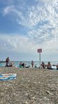 В этом месте мелкий. Для детей хорошо. На выходе есть душ. Метров 30-40 туалет. Недалеко магазинчике, палатки с едой и напитками. На пляже мелкая галька и песочек. Можно ходить без специальной обуви. Из Минусов - здесь всегда очень много народу и тяжело найти место
