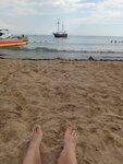 Пляж не очень чистый. Много мусора, окурок, отходов. Хотя люди отходят подальше в курилку, но есть индивидуумы, которые на месте прямо. Но не понимаю, зачем тут же кидать под ноги. Свиньи а не люди. Если не считать этого, песок приятный, есть переодевалка, туалет платный. Установлены краны, чтобы ноги обмыть.