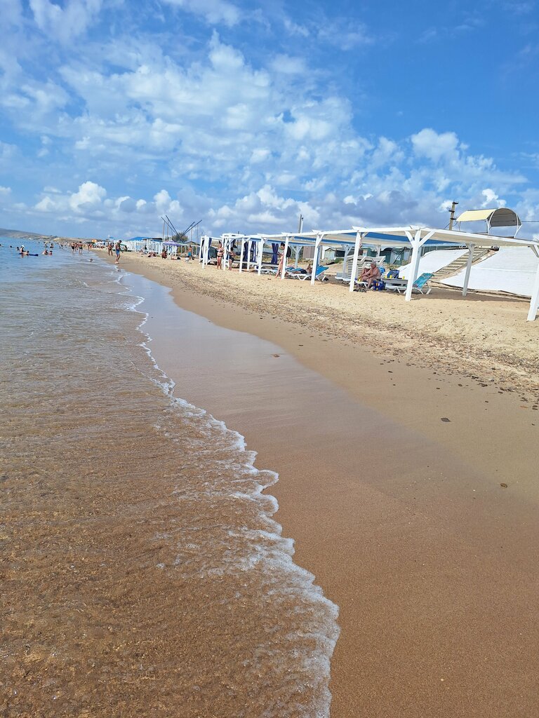 Начало июля 24 года. Пляж наполовину дикий (имеются беседки и навесы под шезлонги но их ещё пока мало). Людей не много. Пляж чистый, тихий (лишь раз индивид на квадрике приехал и врубил колонку). Море спокойное в этот раз холодное. Чистое, но после обеда приплывали медузы, в большом количестве. Так же в 20 метрах от берега несколько раз проплывали дельфины. В пешей доступности несколько ресторанов, минирынок, солёное озеро, лиман для занятия скадрайвингом.