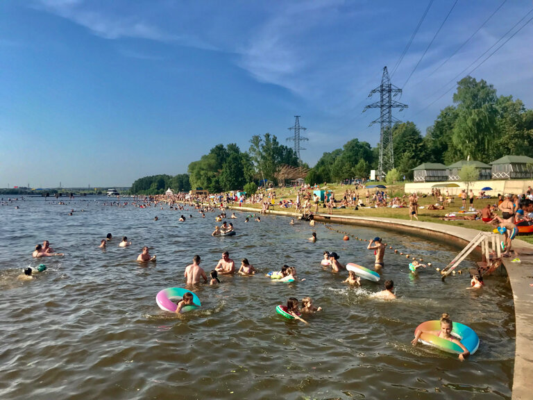 Хороший пляж , вода мутная мусор не обнаружен, на территории тоже мусора не увидели, дно песочек иногда попадаются камни, есть беседки платные, кафешки. Платная парковка от 300 рублей ( легковая) есть на дороге обочина и проход через калитку. Народу не прям так много были 12.07.2025 в пик жары+33 и приехали в обед. Раньше ездил автобус от станции Долгопрудный №33(сейчас уточняйте)