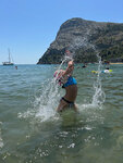 Пляж небольшой, но и людей немного и места хватает. Заход в воду - камни, галька, потом песок. Не напрягает ничуть, поскольку выложены проходы. Не мутная вода. В редких случаях морская гладь, охраняемая грядой гор, сменяется волнами.