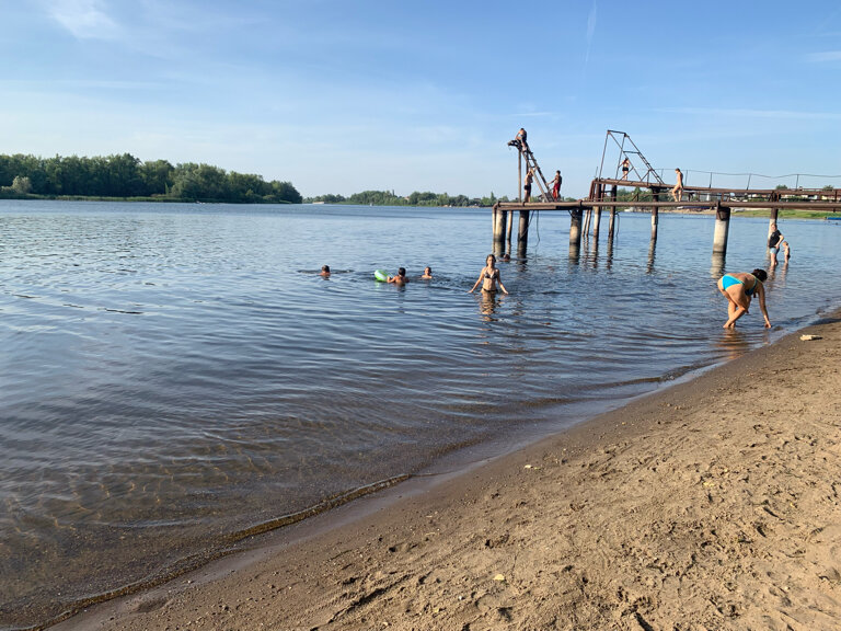 Это место единственное, куда ходим купаться и загорать. Со всех дач приходят люди с детьми. Но грязновато стало плавать из-за водорослей. Дно наполовину с илом. Песок на пляже пора менять. В пыль превращается постепенно .