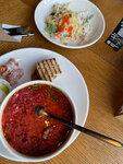 Интересный интерьер, приятная музыка. Обслуживание быстрое, официанты вежливые. Заказала чечевичный суп, приятная консистенция, идеальный по температуре, вкусный, рекомендую