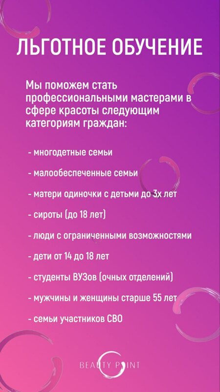 В Бьюти поинт пришла давно, ещё лет 5 назад, в качестве модели. Посещала много разных процедур, была у парикмахеров на окрашивание и стрижке, у косметологов и массажистов, ходила на маникюр и педикюр. Результатом всегда была довольна! Видно сразу, что преподаватели заинтересованы в обучении студентов. Когда у меня стал вопрос о получении новой специальности, я не раздумывая пошла в Бьюти поинт. Чему ни разу не пожалела! Спасибо, преподавателю Алине, что смогла мне доступно объяснить и поделиться своими навыками. Теперь и я дипломированный специалист - Мастер по наращиванию ресниц. Так же прошла обучению по Ламинированию ресниц. Всём советую данную школу. Учитесь и вы не пожалеете!