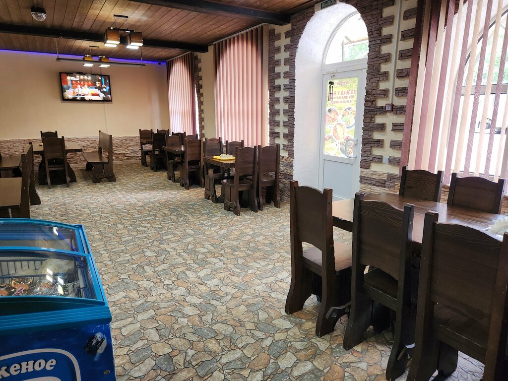Внутри обычная пивнушка со столиками,но можно закать что то перекусить..скромное меню. Из минусов, только то, что на все кафе один человек, который и на кухне и за баром,очень жаль было женщину бегала туда сюда. В целом не плохо.