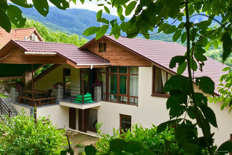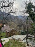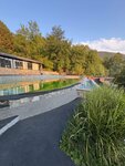 Красивое место. Мы жили в шале. Две комнаты, общая гостиная, кухня ( на кухне всё необходимое - холодильник большой, плита, посуда : кастрюли, сковородки, тарелки, чашки, бокалы , ложки-вилки… разделочные диски. Средство для мытья посуды. Всё что нужно), душевая с туалетом. Кондиционер, ТВ. wi-fi Красивая большая терраса. На территории бассейн, можно заказать чан и баню. В баню мы ходили - всё хорошо, но особенно понравилась задумка с видом из парной на горы🔥 Вода хорошая . Рекомендую! Подъезд сложный. Место холмистое. Недалеко магазин. Администрация на связи.