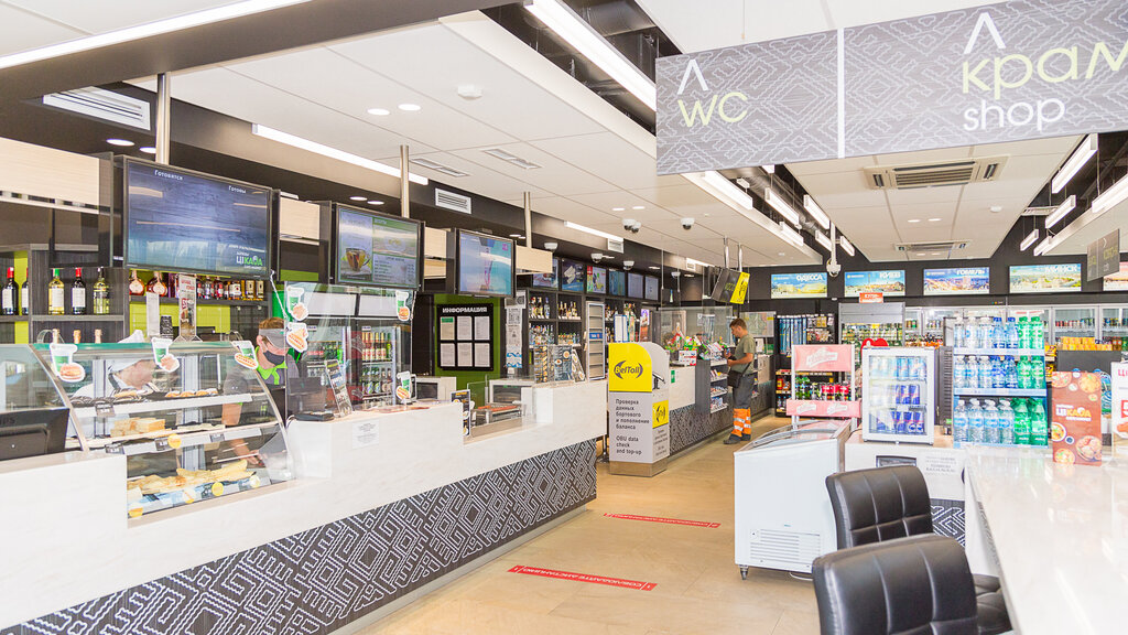 We can have a snack. Buy groceries (milk, cookies, yogurt, etc.) But there is also a disadvantage - this is a single-window ticket office, those who just want to fill up the car also stand in line with those who want to buy coffee or groceries.