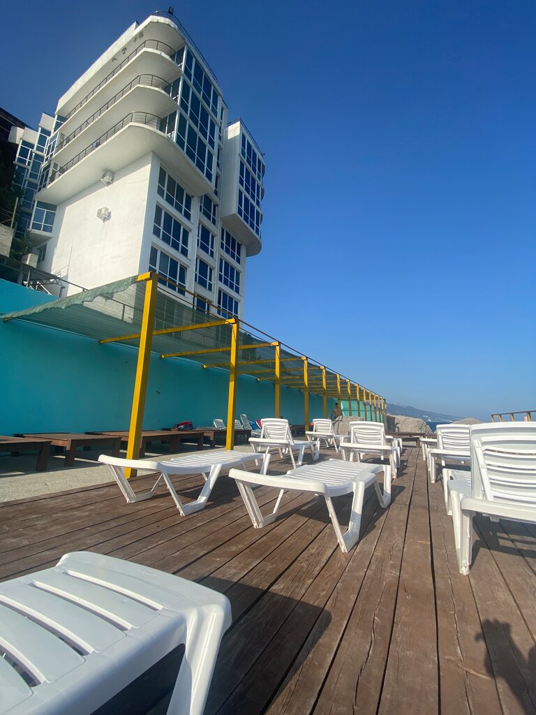 Здравствуйте, все кто будет читать этот отзыв. Мы,попали в этот отель по рекомендации. Добраться на машине до отеля не просто). Петляющие дороги, навигатор зависает. Лучше при заезде в Форос, позвонить управляющему и он по телефону проведет вас до шлагбаума.Первая линия всегда была в приоритете у ценителей отдыха). Тут всё именно так. Есть возможность припарковаться вдоль гравийной дороги у отеля. На первом этаже небольшая столовая где завтракают, обедают и ужинают. Завтраки включены в стоимость. При входе в фойе,стоит холодильник с прохладительными напитками.( естественно платно) Виды из номеров которые выходят на море,обалденные. Номера с балконом начинаются с 6 по 8 этаж. Не у всех прямой вид на море, есть и боковые виды моря.Номера студии,так же красивы и обеспечены всем необходимым для проживания и самостоятельного питания ( свч,электрическая плита на 2 конфорки,холодильник, кухонный гарнитур с посудой). Входная дверь с хитрым но прикольным кодовым Электро замком). Шкаф купе с зеркальными дверям, прикроватные тумбочки, барная стойка,двухспальная кровать, раскладной диван, журнальный столик,две тумбы, обеденный стол с двумя стульями, телевизор, кондиционер. В ванной комнате душевая, туалет, стиральная машина. На балконе стол и два стула. Лучшие номера это с 6 по 8 этаж, с балконом и окнами с прямым видом на море! Они на двоих. Но в них очень классно). Там двухспальная комфортная кровать. Номера с боковыми видами , без балкона,рассчитаны на семью с детьми. Там нет двухспальной кровати, там раскладной диван. В данном номере дополнительная комната с двумя кроватями для детей. Нам данный номер, не зашёл. Большой и приятный плюс, это лифт. На которым вы спускаетесь с этаже и перейдя гравийную дорогу, спускаетесь к оборудованному каменистому пляжу. Про пляж: пляж на против отеля, он относится к отелю и двум соседним деревянным домам,лежаки бесплатные,большие деревянные столы, мостик для прыжков в воду. Те, кто хочет плавный спуск, тут его не получит. Тут сразу ныряют в глубину). Дети в восторге..прыгают и прыгают с мостика.Вода, чистейшая, обжигающий медуз нет. Только безобидные прозрачные. И их очень мало. Из окна можно по утрам наблюдать дельфинов). Рядом с белым парусом доступны катания на катерах и водных мотоциклов. ( стоимость гидроцикла 5000р -10минут, катер 3000р -30минут) Хочу отдельно отметить ,прекрасных и замечательных людей, благодаря которым поддерживается эта жизнедеятельность…Артур и Оксана привет из Москвы!) Они молодцы. Стараются как им позволяют. Я хотел бы, что бы им дали все полномочия всё улучшить. Душевные, милые и спокойные люди..помогают во всех вопросах). Если хотите прекрасный вид и купание, это сюда.