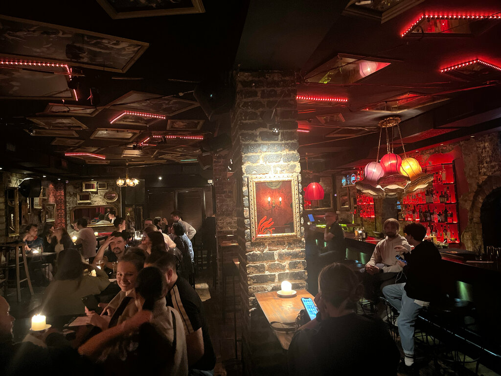 The waiters speak English well and work quickly. The interior is peculiar. The drinks aren't cheap, but they're not bad. There is no food, as far as I know. We were at the stand-up, I liked it.