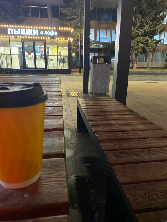 хорошая скамейка 10/10,стол имеется,после дождя на ней можно найти сухое место. Приходите,сидите,ешьте,пейте,живите,кайфуйте. Одно из любимых мест на Центральной площади.Всем советую,всех призываю сидеть тут!!!
