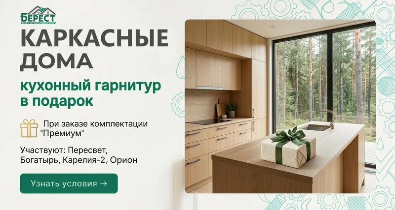 🎁  Каркасные дома под ключ - кухонный гарнитур в подарок при заказе! Мечтаете о новом доме с готовой кухней? Акция от «Берест»: закажите ...