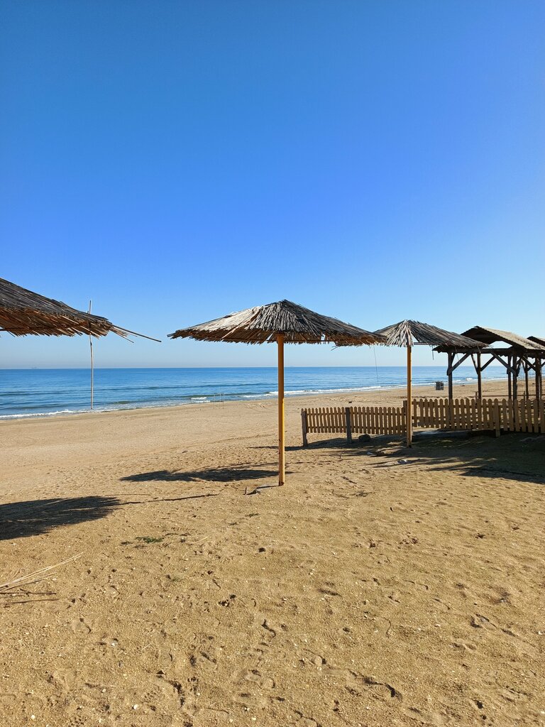 Пляж песочный, в меру чистый. Прибрежная линия довольно протяжённая, есть отдельные кабинки для переодевания как для мужчин, так и для женщин, душевые. Нет так привычных нам туристам назойливых продавцов. Люди культурные и доброжелательные, здороваются, любят и умеют пошутить. Само море чистое и глубина спуска примерно 150 метров для детей, потом начинается глубина для взрослых. Пляж понравился.