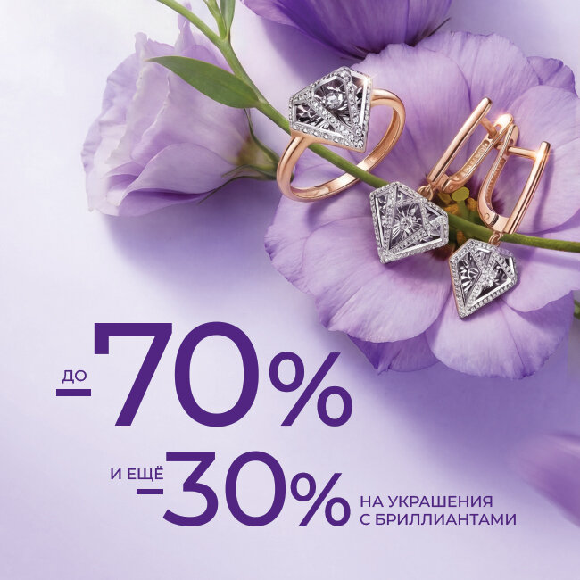 СКИДКИ НА БРИЛЛИАНТЫ. Дарим дополнительную скидку до -70%, а затем еще -30% на весь ассортимент бриллиантовой коллекции! Это ваш шанс приоб...