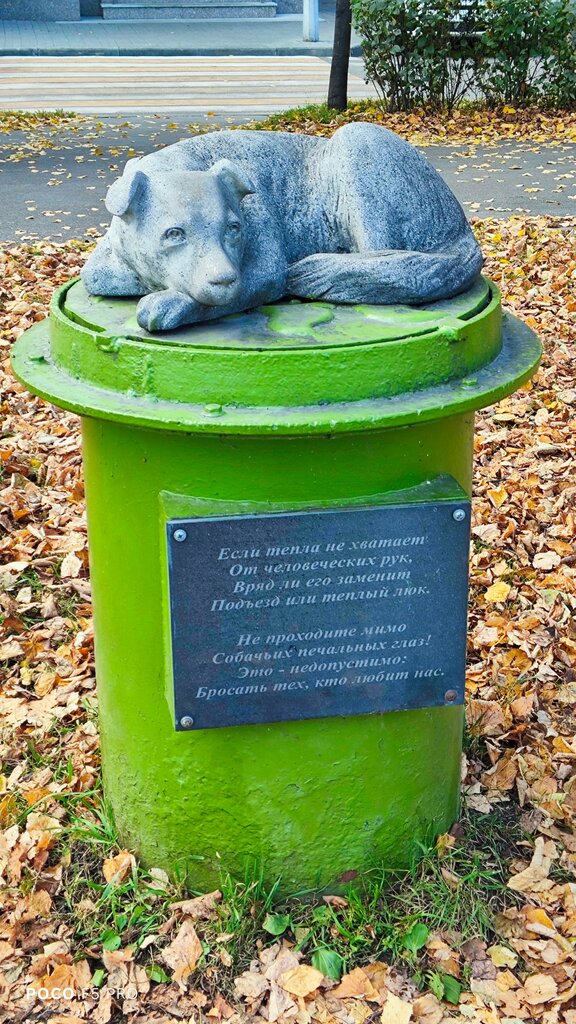 ПАмятник бездомной собаке на набережной Кемерово, пс лежит свернувштсь клубочком и греется на канализационном люке!Мы с женой фоткались у него)