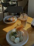 Сотрудники очень милые и приветливые, местоположение и вид — топ. Но два раза заказывала основные блюда, два раза было невкусно. На завтрак драники оказались недоразмороженными хешбраунами, а пасту с курицей и грибами невозможно есть от того, какая она жирная — по ощущениям в порцию блюда влили чашку масла 🥲. Выпечка и лимонады вкусные.