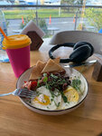 Не очень вкусно,просто съедобно Заказывали боул с курицей ,суп грибной ,омлет. Не очень чисто ,в частности с/у судя по количеству пыли и волос убирается раз в три дня. все на троечку
