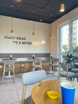 Были в послеобеденное время, брали тирамису и ореховый тарт, чай 300 мл подается сразу в стакане. Очереди не было, другие посетители заказывали салаты и вафли, приготовили быстро (мин 7). Есть уличная веранда, и хватает столиков внутри. Выпечка достаточно вкусная, с учётом того, что в районе прибрежного квартала точек питания или похожих кафешек не много, то рады их открытию, надо ещё попробовать кофе .