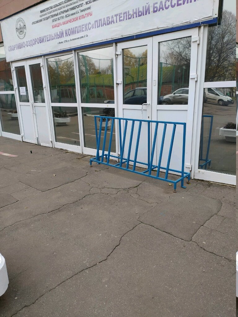 Одна из лучших вело парковок. Основательные трубы качественно сварены и дают гарантию сохранности вело транспорта. Швы между трубами тщательно зашлифованы, еще больше подчеркивая минимализм данной конструкции. Синий цвет успокаивает и помогает концентрировать мысли на важном в данный момент. Отдельно отметить стоит местоположение велопарковки. Таким образом мы получаем двойной функционал, паркинг и блокировка дополнительного выхода.