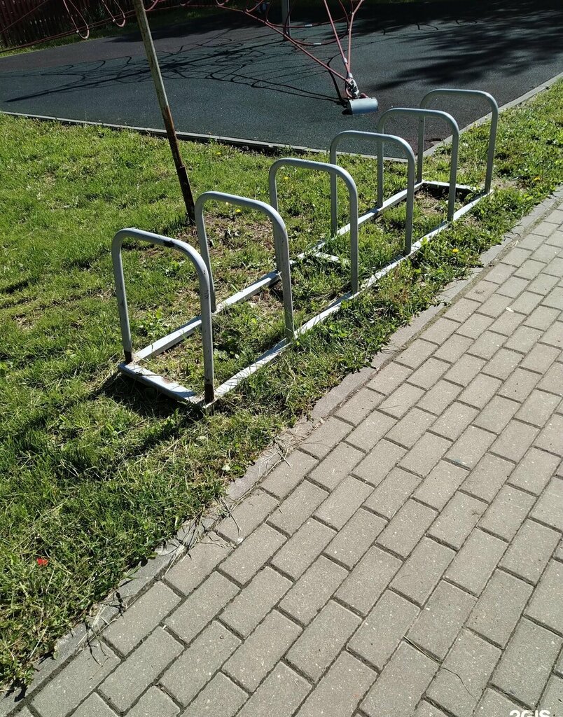 Обычная велопарковка.Используется редко так как нынешние ребята ленятся поставить своë транспортное средство (велосипед,самокат,скейтборд и т.д)на парковку и бросают их на землю.Нельзя сказать то что они забывают так как велопарковка разломана местными молодыми людьми и пользоваться ей уже сложно. В парковке расположено 5 мест для транспортных средств.Парковка серого цвета, выполнена из металла и вкручена в землю шурупами один из которых вырван и его уже как я вижу не собираются прикручивать обратно.
