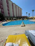 I had a rest from 06/16/24/2023. I arrived at 21.00, they brought me to the hotel around 2.00 am, checked in right away, but it's a long way to go. The main attractions are also very far away. In general, the hotel is not bad, if you take into account the low cost. The pools are clean. The beach is clean, big, good, but 6 out of 7 days there was a red flag, the first day people were still afraid, they had already climbed into the storeroom, the lifeguard scored, but in general it is quite dangerous because of the entrance from the slab and boulders near the shore, for sure for children. There are a lot of sun beds, you need to bring your own towel. Since there are not many approaches along the coastline, and this (as the migrating Russians said the most successful) is a huge pandemonium in the area between the sun beds and the water, people coming, those who do not rent hotel beds (not very pleasant, everything is on the sand on towels with a bunch of things, Anapa). The food is the simplest, for breakfast mostly boiled eggs, there was an omelet twice, there was a thin rice porridge (add sugar + salt, and it's fine), for lunch one side dish was rice (mostly pasta once) and chicken (only she), dinner two side dishes rice + potatoes, from chicken meat and minced meat products (Turkish, specific), greens and vegetables are plentiful, Turkish cheeses of all kinds are soft too. Fruits -apples, oranges, a couple of times there was a watermelon. You won't stay hungry, but even I, as a lover of rice and chicken, howled by the middle of the vacation and attacked the meat upon arrival. The beer is good, but it is paid on the beach (water, soda and coffee in milipizric plastic cups on the beach), you can carry it from the pool bar in special large plastic cups. The white wine is not bad. The room is sooooo tired, the plumbing is in a raid, I think it just won't get off, instead of a blanket there is a waffle sheet (it hurts for a fresh red tan), the mattress is wooden, I put blankets from the closet under the sheets, more or less. Water is not brought to the room. The hammam is not bad. There are sooo few people in the hotel, the same pink building with rooms overlooking the sea was not inhabited at all, empty, the beach is also empty, respectively, but this is even a plus. I rested alone, no one bothered, everyone is very detached and friendly (they storm only the first 2-3 days to persuade you to a hammam and a course of massages, then they are not interested in you fortunately). I had a wonderful rest, including from people, read a book, looked into the distance, swam, which is exactly what I was going for! I'm attaching a photo
