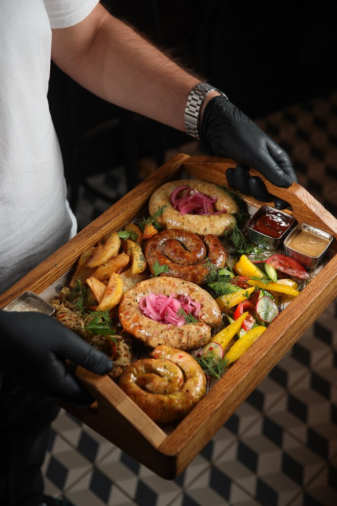 Пивной мясной сет из хрустящих куриных наггетсов, жареных куриных крыльев, копченых свиных колбасок, ломтиков куриного филе в панировке и вяленого свиного мяса. Подается с чесночными ржаными гренками, картофелем «Айдахо», чипсами из пшеничной торт...