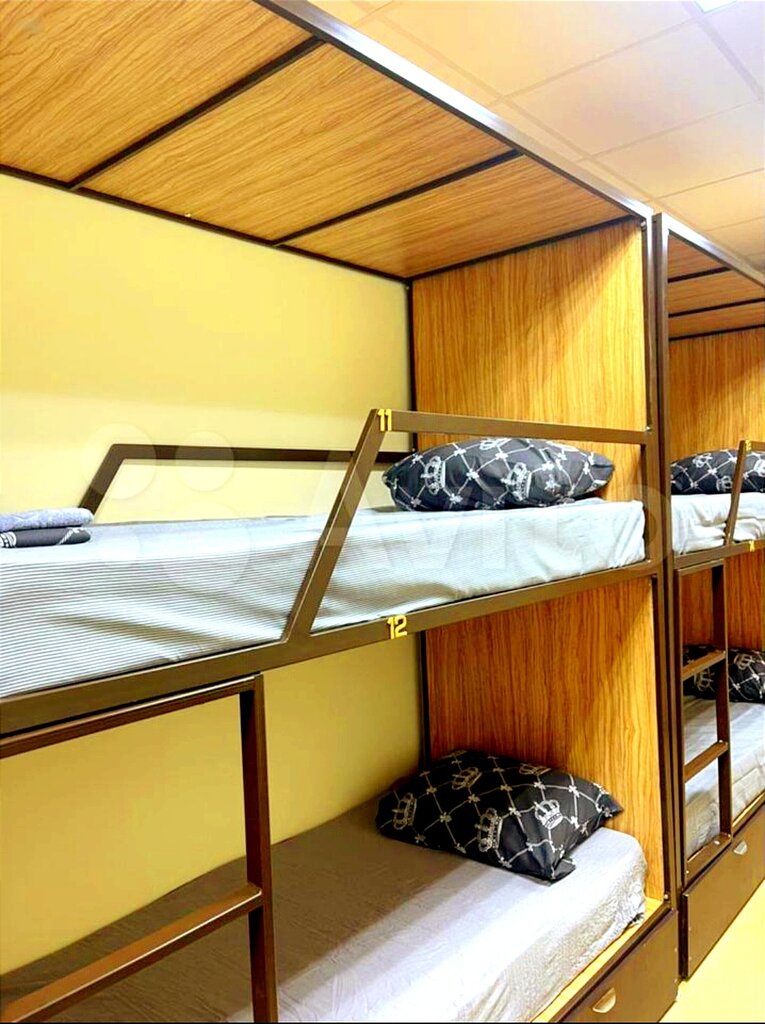 Здание вроде бы рядом, но вход не рядом. Надо заехать, зайти с улицы и обойти здание по часовой стрелке. В принципе не сложно, когда нашёл. В комнате на восьмерых четыре двухъярусных кровати, с шторками. Кровати широкие, бельё чистое, есть окно. Кухням плитой и микроволновой, посуда есть. Отдельная зона питания, столовая с большим телевизором (работает), здесь же холодильник, титан. Санузел с душевой, вроде не один. Внизу на первом этаже есть кофейный автомат. Кстати в комнате есть стол и диванчик и стулья. Розетки в комнате, вроде четыре штуки. Парковка бесплатная.