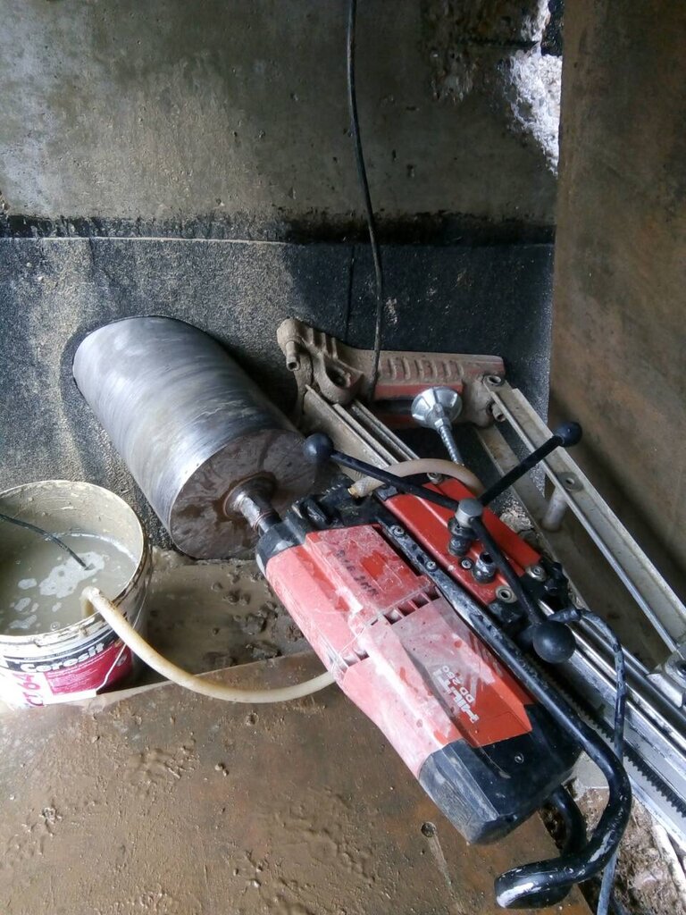 Необходимо было сделать 5 отверстий 120мм диаметром в плите - для канализации и вентканала. Приехали вовремя. Сделали все четко за 55 минут идеальные отверстия (сам бы 2 дня долбил перфоратором и получилось бы неаккуратно). Оборудование профессиональное hilti (Земсков с ютуба бы оценил =)) ). Сделали чисто и аккуратно, без пыли. Всем рекомендую