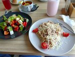 Были в Чайковском на летнем биатлоне. До отправления автобуса было 2 часа, коротая время, решили пообедать в Быстроешке. Всегда сюда заходим, когда приезжаем в Чайковский. В очередной раз убедилась, что здесь очень вкусно готовят❤️ У меня была карбонара, греческий и молочный коктейль. У мужа: солянка, пельмени, чай с лимоном. Всё это вышло на 1400 р. 👍