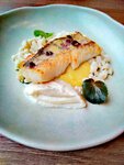 Филе судака, обжаренное до золотистой корочки, подается с нежным пюре из цветной капусты и освежающим лимонным соусом. Обладает деликатным, рыбным вкусом с легкой кислинкой и сливочными нотками.