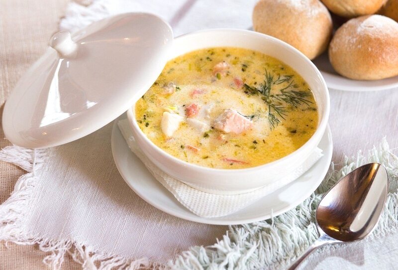 нежный сливочный суп с форелью, горбушей и треской на насыщенном рыбном бульоне с овощами. С добавлением сливок, лука порей и икры горбуши