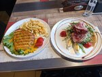 Еда вкусная,порции большие,кофе вкусный,блины большие и вкусные. Сначала думала как в столовке,но оказалось вкусно. Обстановка барная,в основном сидят пьют пиво. Подача блюд быстрая,официантка хорошо обслуживает . В коридоре и туалете правда пахнет очень куревом.
