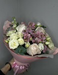 Букет из разнообразных экзотических цветов в нежных тонах: эустома, диантус, альстромерия, роза