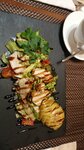 Здравствуйте. В кафе "Блюз" мы провели торжественный обед (на фото салаты порционные, мясная и рыбная тарелки) на втором этаже. Еда очень вкусная, порции нормальные. Обслуживание тоже очень понравилось.
